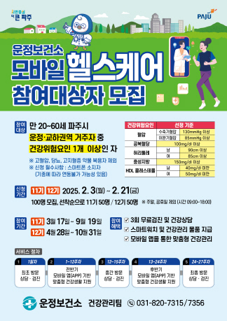 파주 운정보건소가 2025년 ‘모바일 헬스케어’ 사업의 11기와 12기 참여자를 각 50명씩 선착순으로 모집한다.