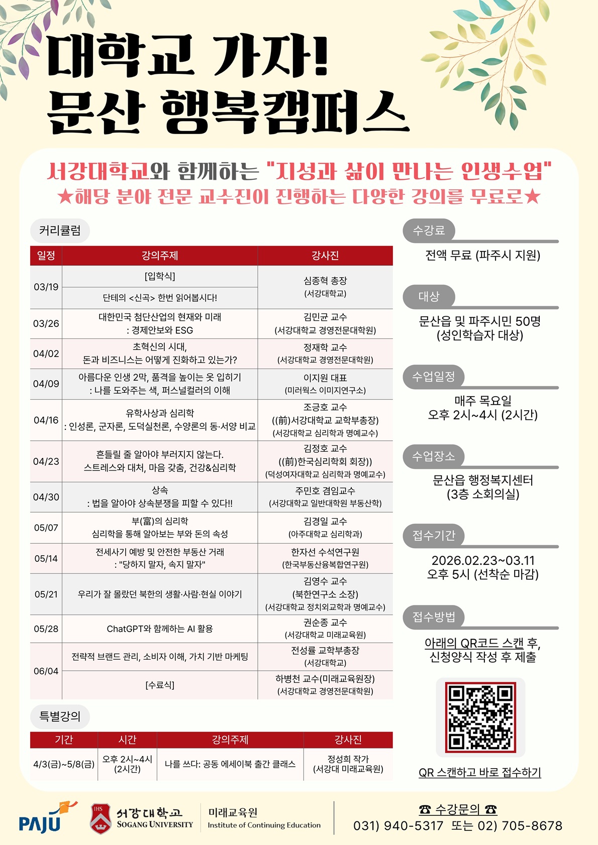 수강 신청은 2월 23일 9시부터 홍보물 내 정보 무늬(QR코드)를 통해 할 수 있으며, 선착순으로 모집한다. 자세한 사항은 파주시청 누리집에서 확인할 수 있다.