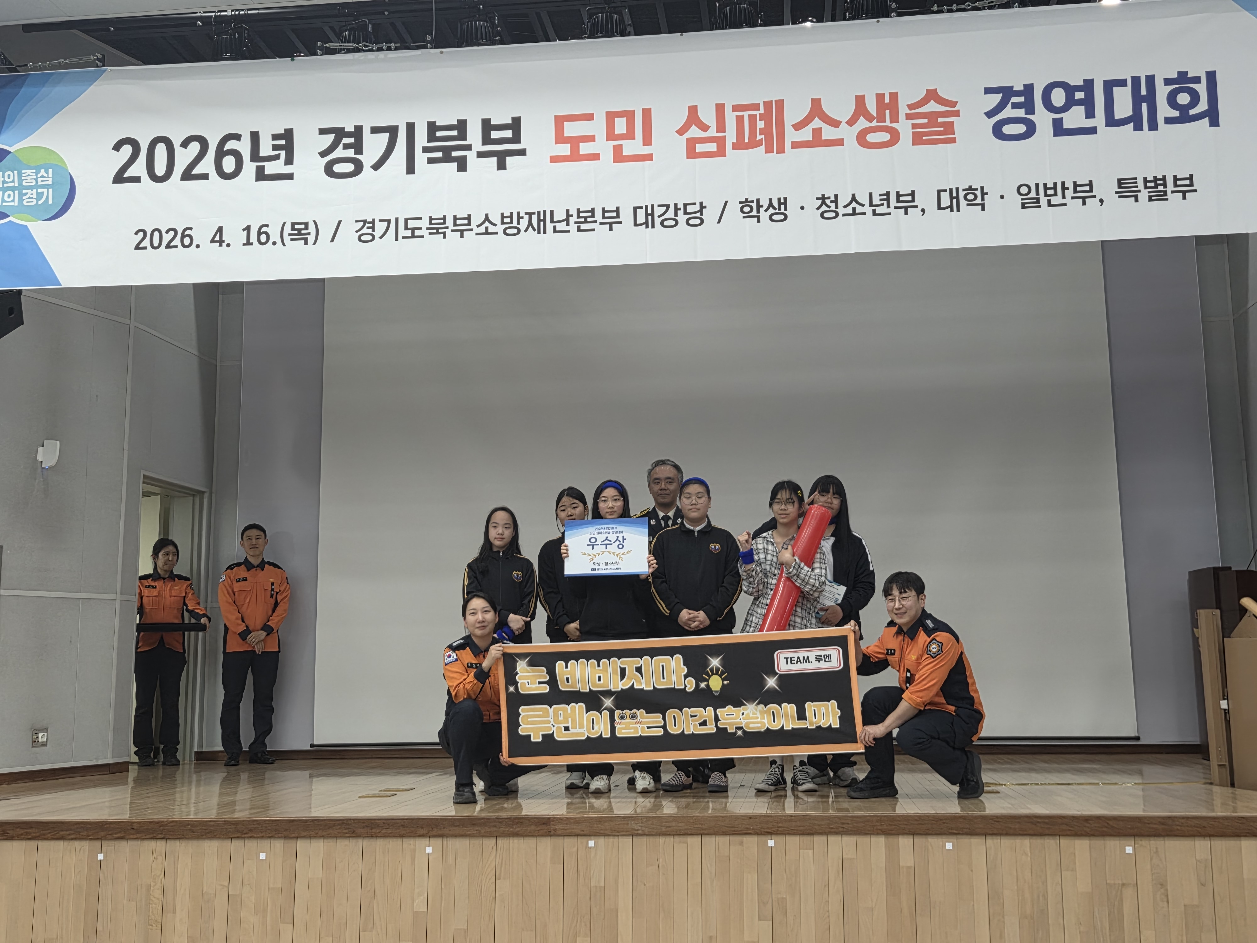 파주시청소년수련관은 지난 4월 16일 경기도북부소방재난본부에서 열린 ‘경기북부 도민 심폐소생술 경연대회’에 파주소방서 대표로 출전한 청소년 6명(TEAM. 루멘)이 학생·청소년부 우수상을 수상했다고 밝혔다.